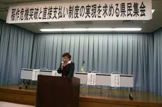 米価の下落・仮渡金の減額で稲作農家はコスト割れを起こし危機的状況に追い込まれています。生産農家が・消費者が・安心できる農政の実現に向けて関係団体や認定農業者・消費者の代表が集まって県民集会が行われました。