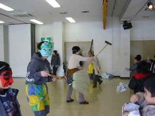 新聞紙で作った金棒?と豆で鬼を攻撃・・災害鬼や悪い鬼をみんなで退治した。