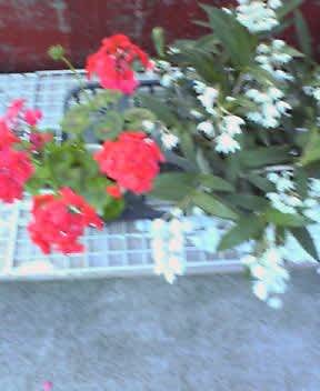 画像は、お隣ご近所に咲く「ゼラニューム」と「ギンギアナム」・・赤と白のコントラストがきれいでまたまた携帯カメラでパチリ