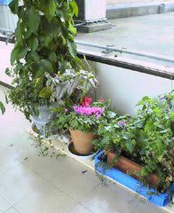 市役所渡り廊下に置かれた緑の鉢植え・・・心癒してくれています。