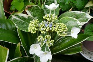 我が家で咲いた「斑入りの葉っぱのアジサイの花」・・正式な名前がわかりません。またまた、お花に詳しい方からの情報をお待ちしています。