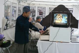 紙芝居の上演風景・・・いつもは自転車に木枠を乗せていろいろな所を訪問なさっているそうです。自然な語り・・昔懐かしい紙芝居でした。