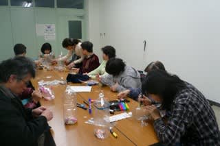 今日の画像はペットボトルでボーリングピンを作っているところです。