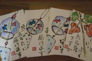 午後絵手紙のサークルへ・・・介護施設から暑中見舞いの絵手紙を描いてほしいという依頼があったそうです。一人が5~6枚を描くという宿題が与えられました。