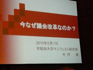私は第2分科会に参加しました・・議会改革とローカルマニフェスト、議会改革の取り組みとマニフェスト作りについて岩手や京都の議会の実践例を伺ったり、早稲田大学の中村講師の「なぜ今議会改革なのか」や名古屋大学 後 房雄講師の二元代表制の矛盾についてお話を伺いました。