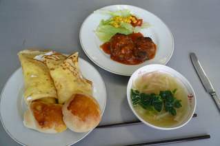 今日のメニューは・・・・自家製パンにハンバーグ・クレープにスープです。