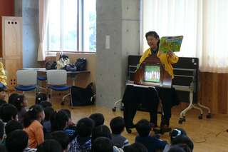 新1・2年生と先生方に大型絵本や紙芝居・ストリーテーリング・手遊びで1時限楽しい空間を共有しました。