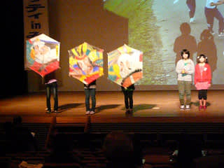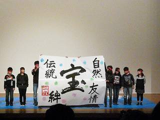 先生と地域の人との掛け合いあり、子ども達の合唱あり、伝統の凧が登場したり、書道パフォーマンスありとバラエティに富んでいました。