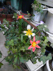 木目の美しいプランターに、お花大好きなご近所のWさんが寄せ植えしてくれたものです。