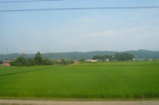 車窓からは緑が目にもまぶしい稲穂の田園風景。