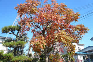 ご近所Мさんの庭木も青空に映えて美しい紅葉を見せていました。