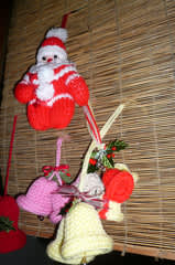 我が家の玄関に母手づくりのサンタとベルがお目見えしました。