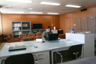 議員執務室で議事録と資料の検索。