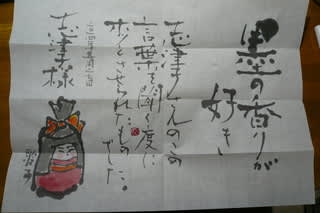 「大丈夫。自分の歩幅でゆっくりつづけましょう。いっぱい恥をかくことを恐れず、裸になれたら絵手紙がもっとたのしくなるはず。素敵な先生と仲間に学ぶつもりで・・お互いに無理をしないでも前を向いていきましょうネ」・・先生の優しいお人柄が表れているお手紙でした。