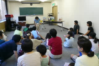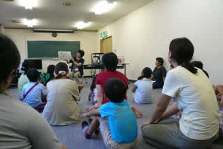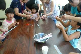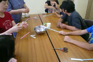 絵本の後には「科学の万華鏡」の宮先生をはじめメンバー4人の方々から「ストロートンボ」と「ストローロケット」のご指導をいただきました。