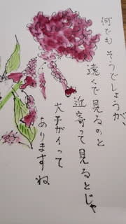 展に向けて、先日S先生の教え子たちが集まって準備開始・・今仲間に入れていただいているクラスでも一人後追いの私ですが、今日はもう一クラスの生徒さんから絵手紙を頂戴しました。