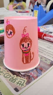 「紙コップに自分の好きな絵を描いて・・」メンバーの言葉に、最初子どもたちの手が動きません