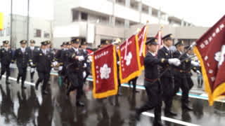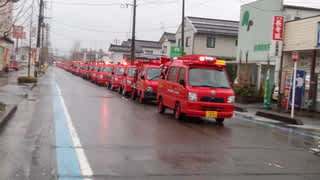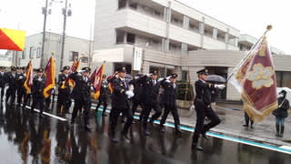 みぞれ混じりの寒い日となりましたが、最後に消防団幹部や消防車両・救急車の分列行進が行われ沿道の市民からもご覧いただきました。