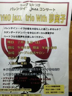 2月13日(土)午後6時30分からネーブル交流サロンで「バレンタインjazzコンサート「YMO Jazz trio with 夢実子」が開かれる。
