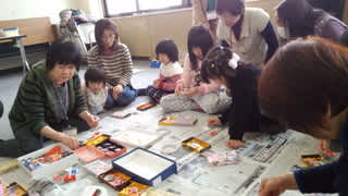 絵本のあとに、みんなで貝殻を使っての「お雛様」をつくりました。