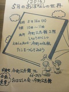 今日から5月・・ 2016年5月1日 最終更新日時 : 2016年5月1日 s-shizuko 早い早い 今日から5月・・五月のおはなしの世界のお知らせをします。 5月14日(土) 午前10時~11時 今町公民館 2階 視聴覚室 絵本のあとは・・今町の伝統「凧」をつくってみよう 参加費無料 お問い合わせは今町公民館(66-2313) お家の方もご一緒に絵本の世界をお楽しみ下さい \ 最新情報をチェック /
