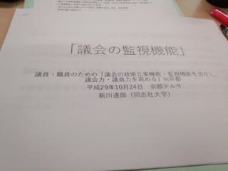 1日3セミナー・・龍谷大学土山先生の「議会による政策〈制御>のシステム・同志社大学准教授飯田先生の「エビデンスと政策立案」・同志社大学大学院教授新川先生の「監視機能から議員力・議会力を高める」をテーマに2時間のセミナーが3回。一日みっちりのセミナ―でした。