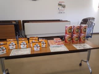 公民館の大集会室には、議会で一般質問をしたアレルギー対応や糖尿患者対応の避難食の展示もされていました。