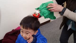 今町公民館視聴覚室に入室してきた子供たちにまずは健やかに育つようにと獅子頭でコツコツ