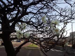 市役所正面の、姉妹都市ブラジル・マイリンケ市からの記念植樹された紅白の梅が、青空に映えていました。