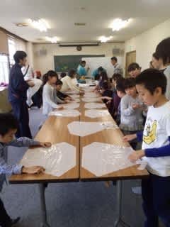 絵本のあとに、五丁目凧組さんのご指導でみんなで「ぐにゃぐにゃ凧」づくり。