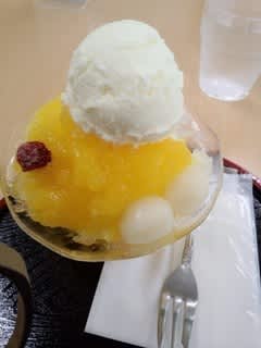 今日は、氷いちごも抹茶もなくて、マンゴーシロップ氷を頂きました