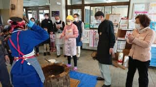 子どもたちみ~んな、小さな杵をお借りして「よいしょ・よいしょ」のかけ声に合わせてぺったん・ぺったん