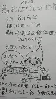 8月の「おはなしの世界」は、一週前倒しで8月6日の土曜日です。
