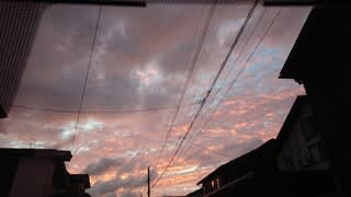 今日夕方の空・・雲の隙間から茜色の夕日が覗いていました。