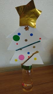 ペットボトルに色水入れて・キラキラ入れて・・シール貼ったりモールを付けてりして手作りXmasツリーを作りました。