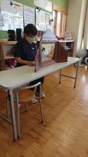 絵本に紙芝居・・メンバーが演じた紙芝居「さらやしきのおきく」はおちがあって、子どもたちと一緒になって楽しみました