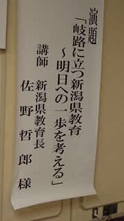 研修会では、新潟県佐野哲郎教育長をお迎えして「岐路に立つ新潟県教育 ~明日への一歩を考える」と題してご講演いただきました。