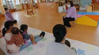 今町子育て支援センターでは、若いママのお膝にちょこんとお座りして親子で聞いてもらいました。