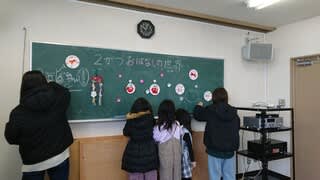 常連さんのお子さんはさっそく黒板にタイトルのお絵かき