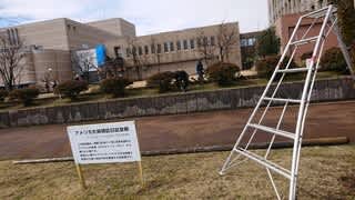 このところの寒の戻りの見附市ですが、今日は市役所正面の冬囲いの縄の取り外し作業が行われていました。