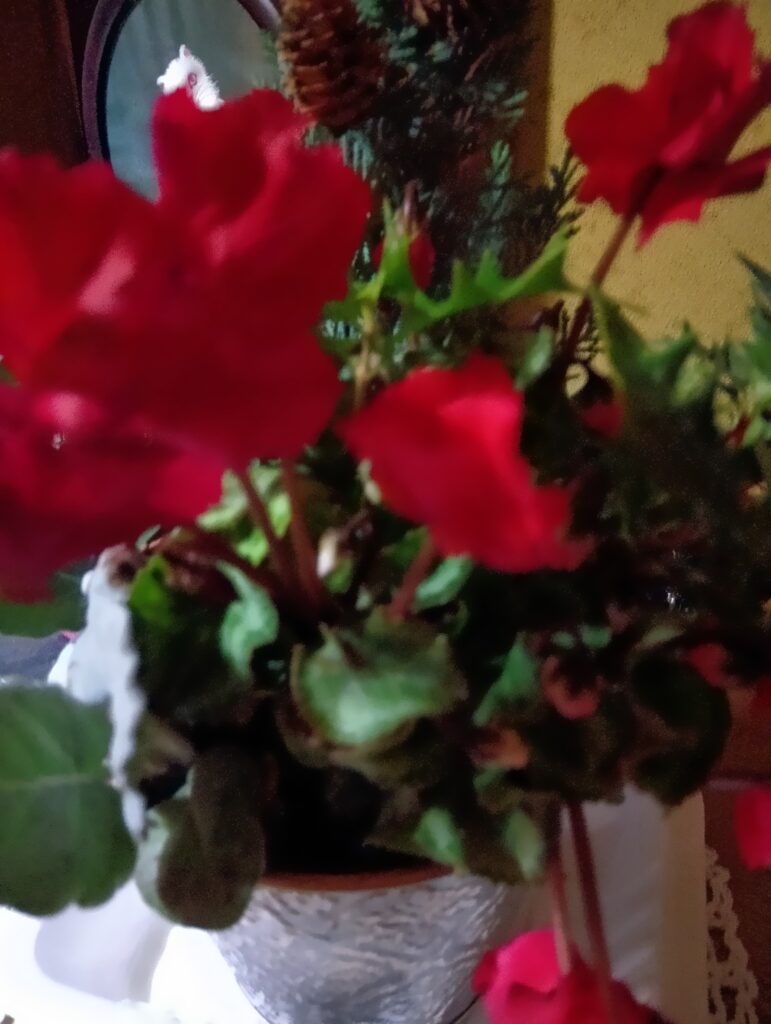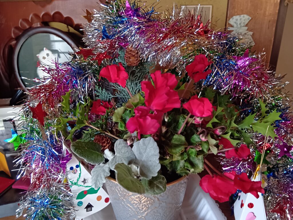 手作りしたクリスマス飾りを、玄関に置いたXmasバージョンの生け花に飾ってみた(⌒∇⌒)